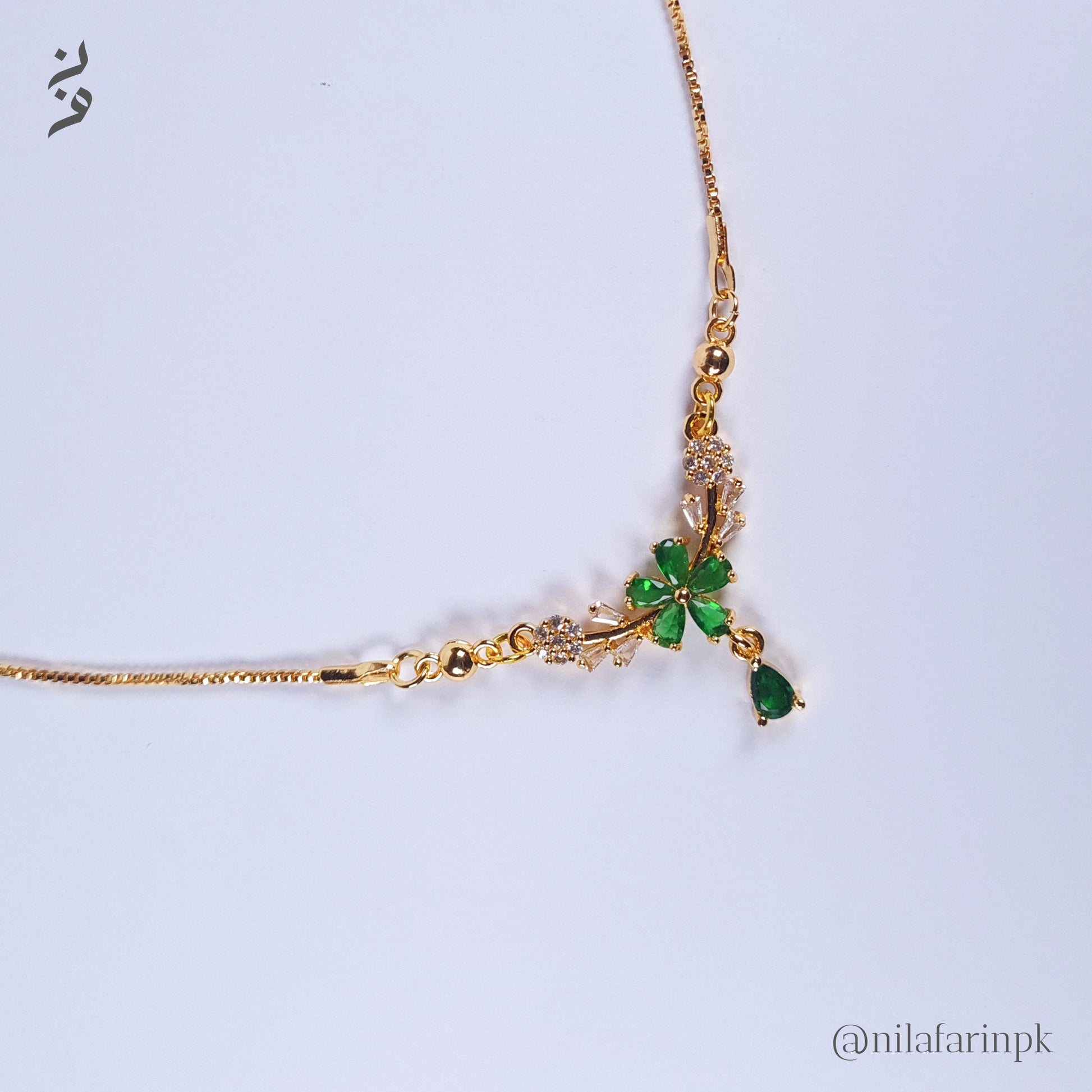 The flower is accented by sparkling clear CZs, mimicking leaves and buds on a graceful gold-toned vine. A small, coordinating green teardrop stone dangles gently below, adding movement and finish. The whole motif is secured on a polished, fine gold-plated chain (likely a sleek snake or box chain style).